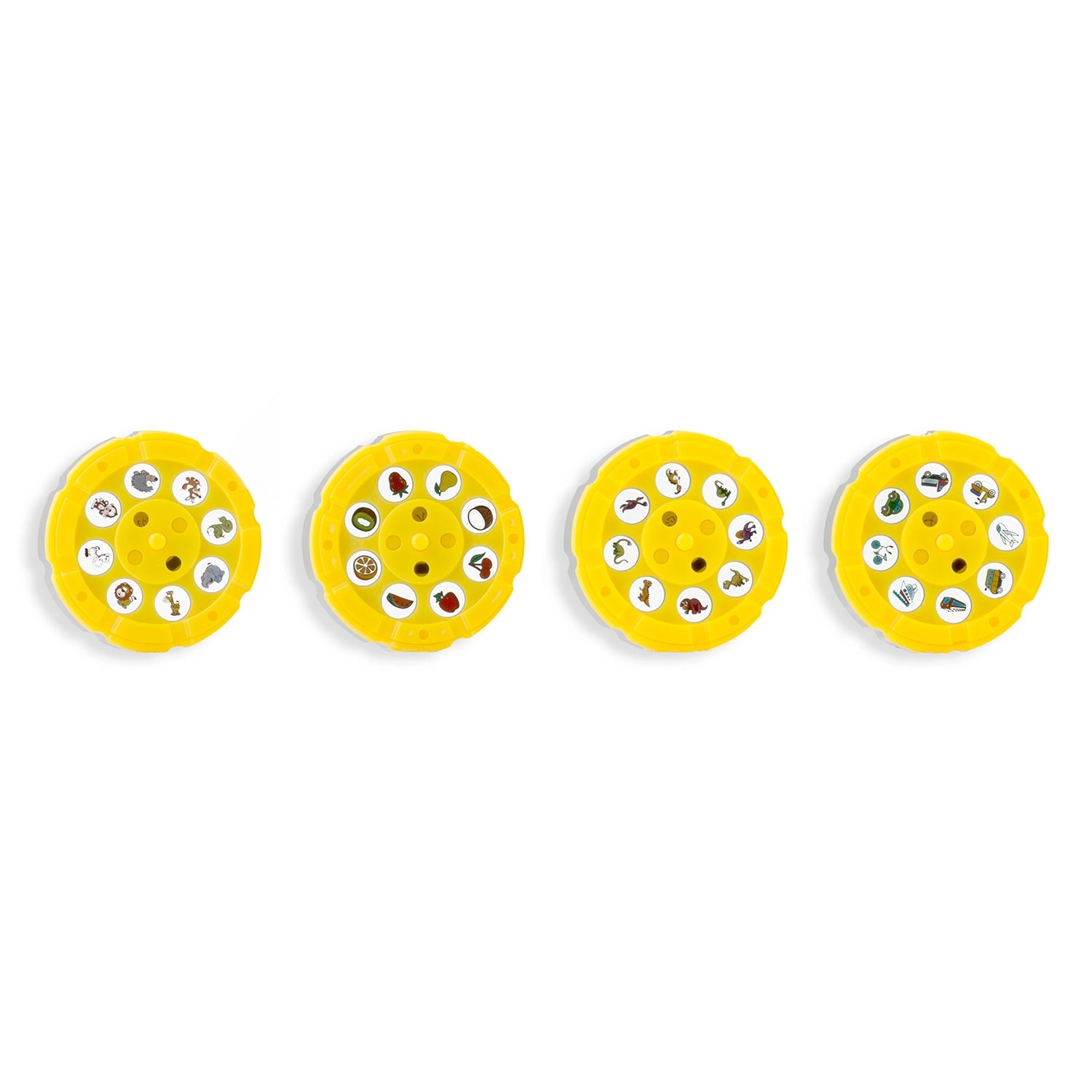 Štirje rumeni diski ponujajo tematske motive (dinozavri, vozila, sadje in zelenjava, živali). Otroci zlahka izberejo in projicirajo predlogo za prerisovanje in barvanje.