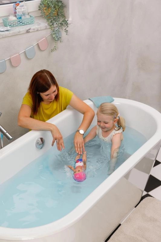 Punčka BABY born plavalka Lizzie je odlična za prve pozitivne izkušnje z vodo. Preprosto navijte njene roke, jo položite na gladino in opazujte, kako plava sama. Realistični gibi kravla in delfina prebujajo otroško domišljijo in spodbujajo fino motoriko.
