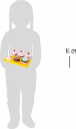 Vsi deli so izdelani iz robustnega lesa in okrašeni z neoporečnimi, živahnimi premazi, ki prenesejo vsakodnevno igro. Set se odlično ujema z otroško kuhinjo, trgovino ali kavarno ter podpira igre vlog in učenje pravil strežbe.