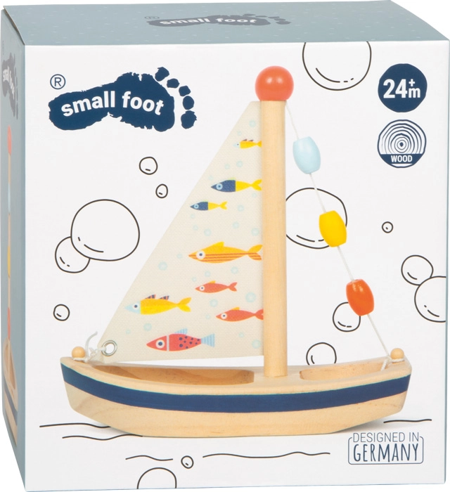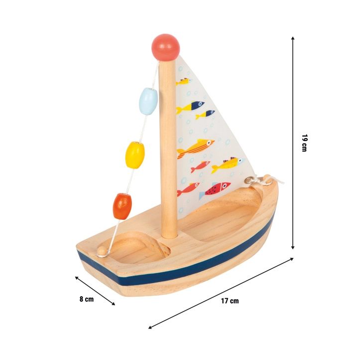 Ta stilska lesena jadrnica prinese v vsako kopel in poletne vodne igre odmerek domišljije. Naravni les dopolnjuje potiskano tekstilno jadro z veselimi ribicami ter barvne kroglice na jamboru, ki pritegnejo otroke in spodbujajo čutno zaznavanje. Igrača je lahka, dobro sede v otroško roko in po vodni zabavi jo je dovolj preprosto osušiti, da je pripravljena na naslednje plovbo.