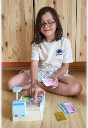 - Celovit komplet: blagajna, skener, čitalnik kartic, igralni denar in lesena kreditna kartica