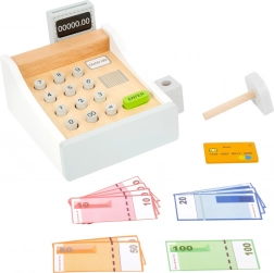 Stilna lesena blagajna v beli barvi podpira igranje vlog, razvija osnove matematike in uči otroke ravnanja z denarjem. V kompletu so skener, čitalnik kartic, igralne bankovce in lesena kreditna kartica – vse pregledno shranjeno v predalu. Idealni dodatek za vsako otroško trgovinico.