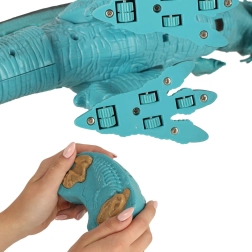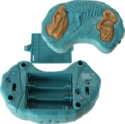 Daljinski upravljalnik, ki spominja na fosil, s dvema gumboma olajša upravljanje gibov in zvokov dinozavra.