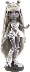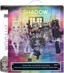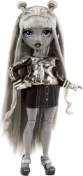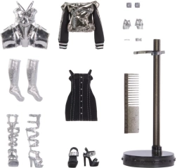 V kompletu je stilni outfit v odtenkih sive, črne in srebrne, dopolnjen s čevlji, nakitom in stojalom. Bogat nabor dodatkov podpira domiselno igro, mešanje stilov in zbirateljsko razstavljanje. Vstopite v rivalstvo šol RAINBOW HIGH in SHADOW HIGH ter ustvarite svoje modne scenarije.