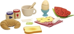 Privoščite otrokom igriv zajtrk s čudovito izdelanim kompletom VILAC. V paketu najdete narezano jajce, toast, sir, rogljiček, 2 marmeladi, skodelico čaja s čajno vrečko in rezine lubenice. Vse je izdelano iz kakovostnega lesa in filca za dolgo življenjsko dobo in pristnost.