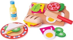 V kompletu najdete vse za pripravo okusnega sendviča: bageto, rezine kruha, majonezo, solato, kumaro, sir, jajce in paradižnik, dopolnjeno s krožnikom, rezalno desko in nožem. Materiali izvirajo iz odgovornih virov in igrača izpolnjuje evropske varnostne standarde, zato ji lahko zaupate.