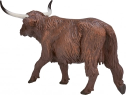 Podroben plastični model škotskega višavskega bika z dolgo teksturo dlake in izrazitimi rogovi.