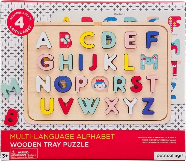 Zabaven in barvit komplet za prve črke: lesena abecedna sestavljanka z 26 zaobljenimi kosi uči otroke prepoznavati abecedo in nove besede v 4 jezikih. Ko dvignete črke, se pojavijo čudovite ilustracije. Komplet je iz lesa s certifikatom FSC in potiskan z barvami na vodni osnovi. Primerno od 3 let.