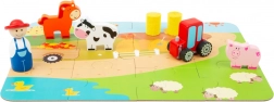 Pujsek kvika, traktor brni. Prenosna igra v čudovitem kovčku; otroci si lahko s pomočjo lesenih igralnih figuric v obliki traktorja, domačih živali in kmeta ustvarijo svojo lastno kmetijo. Najprej iz koščkov sestavite osnovo, nato se lahko začnete igrati! K popolnosti kmetije pripomorejo figurice bal sena. Potopite se v podeželsko življenje in pustite domišljiji prosto pot. Kovček je izdelan iz trpežne kovine, ročaj je lesen, ključavnico pa je mogoče preprosto odpreti. Primerno za otroške sobe, igralnice ... Glavne lastnosti: vsebuje 12 kosov puzzlov ter kmeta, traktor, pujseka, kravico, konjička in bale sena; praktična embalaža – kovinski kovček z lesenim ročajem