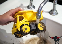 Igrača posnema velike gradbene stroje, njen izrazit rumen videz pa pritegne pozornost vsakega malega graditelja.