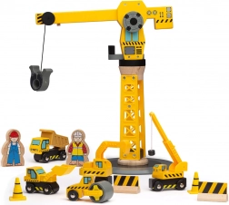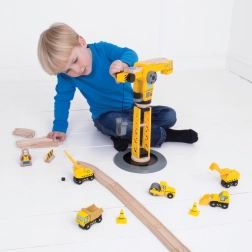 Set odlično dopolni otroške sobe in lesene vlakovne proge – je združljiv s priljubljenimi sistemi. Otroci lahko nakladajo in razkladajo tovor, vozijo buldožer, kiparja ali valjar, urejajo promet s stožci in zaporami ter ustvarjajo lastne zgodbe z gradbišča.