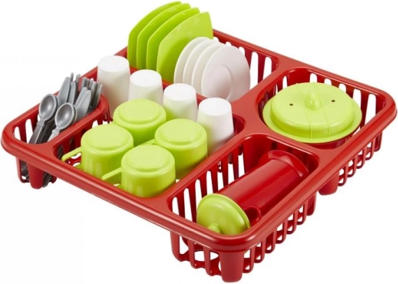 Ta velik komplet posode z odcejevalnikom je idealen za prve kuhinjske igre. Vključuje pestro izbiro dodatkov – od lončkov in krožnikov do lonca in čajnika s pokrovko. Trden odcejevalnik z merami 29,5 × 10 × 29,2 cm ohranja vse pregledno na svojem mestu in spodbuja navade reda.