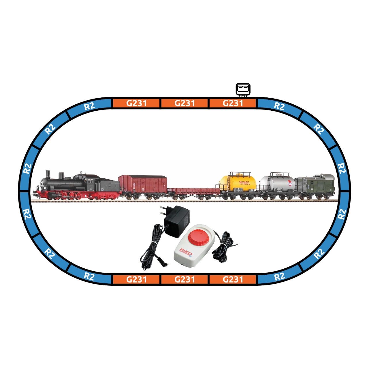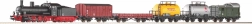 Parna lokomotiva BR 55 s tenderjem, 5× tovorni vagon, 12× lok R2 s podlago (55412), 5× ravni tir G231 s podlago (55401), 1× ravni tir G231 s priključkom napajanja (55406), podloga za sponko (55447), napajalna sponka (55270), osnovni analogni upravljalnik z napajalnikom (55003)