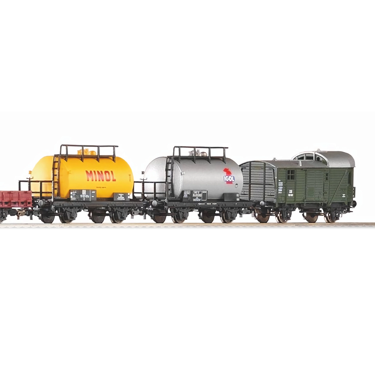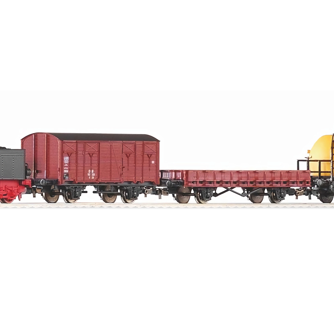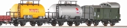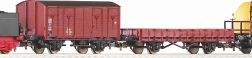 Komplet vključuje mešanico tovornih vagonov DB iz ere III – zaprt vagon, ploščadni vagon in cisterne – za prilagodljive kompozicije in realistične tovorne scenarije na vaši progi.