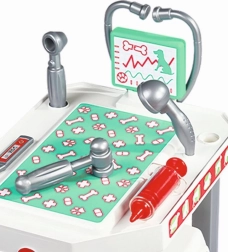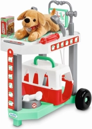 Ta igrivi set spodbuja domišljijo, skrbniške veščine in fino motoriko otrok. Mobilni voziček omogoča, da ordinacijo prestavite kamor koli, medtem ko bogata oprema nudi vse, kar je potrebno za pregled in oskrbo ljubljenčkov. Plišasti kužek služi kot idealen prvi pacient in motivira k igri vlog.
