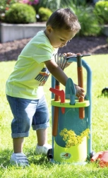 Zabaven in praktičen set za male vrtnarje: barvit voziček na kolesih z zalivalko in kompletom orodja. Spodbuja igro na prostem, razvoj motorike in učenje skrbi za vrt skozi igro.