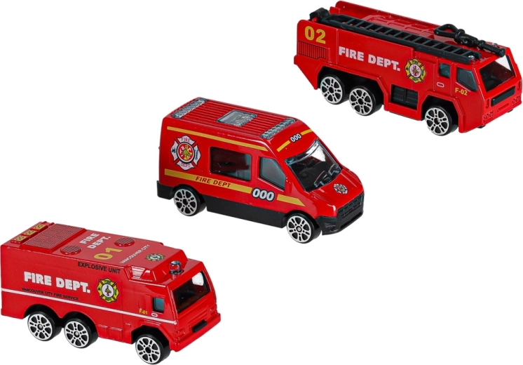- 3 rdeča gasilska vozila: vozilo z lestvijo, oklepni transporter, mestno vozilo