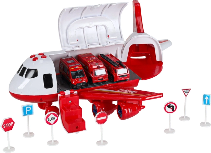 V kompletu so 3 gasilska vozila in set 7 prometnih znakov. Vse se prilega v notranjost letala, zato je vse pospravljeno in pripravljeno na pot.
