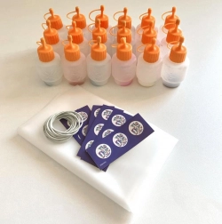 18 stekleničk z različnimi barvami za tie-dye. Dopolnilo k izdelku M5200058.