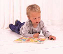 Ta lesena abeceda s slikami je idealna izobraževalna igrača za predšolske otroke. Otroci se naučijo prepoznavati oblike črk in njihov pravilen vrstni red, hkrati pa urijo fino motoriko pri vstavljanju koščkov v ploščo. V vsaki črki najdejo tematsko sliko živali, ki se začne na dano črko, kar podpira besedni zaklad in naravno učenje.
