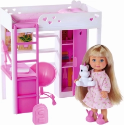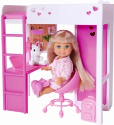 Ljubka punčka Evi Love uživa v svoji trendi sobici s pogradom, pisalno mizo in številnimi dodatki. Set v belo‑rožnati barvi z motivi srčkov vsebuje stol, prenosnik, nahrbtnik, šolske potrebščine in prikupnega samoroga. Odlično za kreativno igro in pripovedovanje zgodb za otroke od 3 let.
