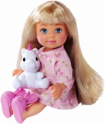 - Punčka Evi (pribl. 12 cm), loft postelja z lestvijo, pisalna miza, stol, nahrbtnik, prenosnik, šolski dodatki, figurica samoroga in drugo pribor (skupaj 14 kosov)