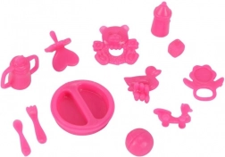 Set vsebuje različne rožnate plastične igrače kot so krožnik, pribor in steklenička, ki obogatijo igralne izkušnje.