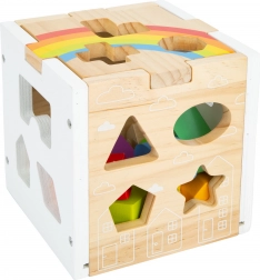 Ta moderna lesena vstavljanka SMALL FOOT izstopa s čistim videzom naravnega lesa v kombinaciji z belimi paneli in pisanimi deli. Otroci v odprtine vstavljajo oblike, kot so krog, zvezda, trikotnik, križ, oblaček ali hišica, s čimer na igriv način razvijajo fino motoriko in logično razmišljanje.