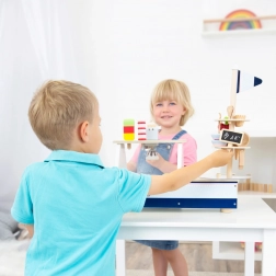 Komplet vsebuje tudi skledo z žličkami, vaflje in različne dodatke. Vse je zasnovano v nežni in spolno nevtralni zasnovi, zato je odlično za vsakega otroka. Dimenzije stojnice: 45x21x47 cm, višina delovne površine: 11 cm.