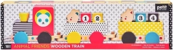 Ta sodoben leseni vlak ima lokomotivo in dva vagončka, štiri kocke s številkami ter dva prikupna živalska prijatelja. Otroci ga lahko vlečejo za vrvico, gradijo in premeščajo kocke ter figurice, pri tem pa razvijajo domišljijo, logiko ter fino in grobo motoriko.