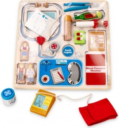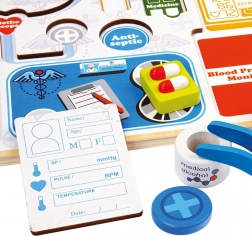 Ta barvita vstavljanka znamke Bino otrokom na igriv način predstavlja svet zdravstva. Zaradi jasno oblikovanih koščkov otroci zlahka prepoznajo in uvrstijo stetoskop, termometer, injekcijo in druge pripomočke na pravo mesto na plošči. Med igro vadijo prijem, zbranost in potrpežljivost.