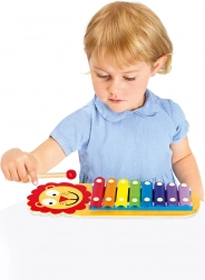 Otroški ksilofon z veselim motivom levčka prinaša zabavno učenje in kreativno igranje. Osem barvitih kovinskih ploščic na lesenem okvirju zveni jasno in prijetno, zato otroci zlahka odkrivajo tone, ritem in prve melodije. Del paketa sta dve leseni paličici za udobno igranje z obema rokama.