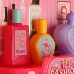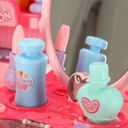 V kompletu so glavnički, ogledalce, stekleničke, dodatki za lase in drugi rekviziti za realistično igro frizerstva in kozmetike.