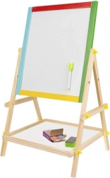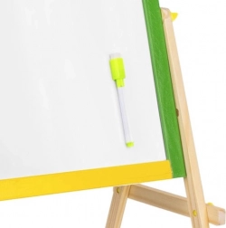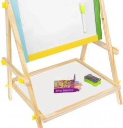 Dvostranska lesena tabla za otroke s črno in belo (suhobrisno) stranjo spodbuja ustvarjalnost, učenje in fino motoriko. Barvni okvir je iz gladko obdelanega lesa, stabilno konstrukcijo dopolnjuje praktična polica za pripomočke. V paketu najdete flomaster, gobico in krede – pripravljeno za takojšnjo uporabo.