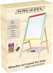 Ta dvostranska tabla KRUZZEL ponuja dve površini za risanje in pisanje: kredno in suhobrisno. Preprosto vrtenje in metuljasti vijaki omogočajo hitro zamenjavo strani. Lesen okvir z barvnimi elementi je trden, gladek in varen za otroke.