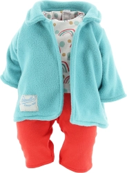 Oblačilo Petitcollin Arthur vsako punčko velikosti 36 cm spremeni v elegantnega spremljevalca za igro. Komplet združuje turkizen flis pulover, veselo vzorčasto bluzo, rdeče kratke hlače in ujemajočo kapico – skupaj ustvarjajo privlačen in udoben outfit za vsakodnevne dogodivščine.