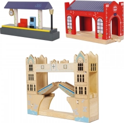 Ta velika lesena železniška proga popelje otroke v srce mesta, navdihnjenega z Londonom. Z bogato opremo – od postaje in pisanih stavb do ikoničnega dvižnega mostu – ponuja nešteto igralnih scenarijev ter spodbuja odprto, domišljijsko igro. Dva vlaka z magnetnimi vagoni se zlahka spajata in varno vozita po stabilnih lesenih tirih.
