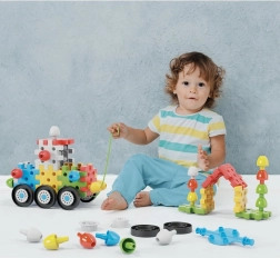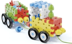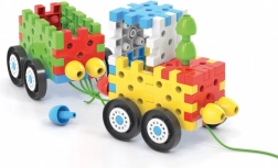 Sestavljajte iz ploščic in zatičev avtomobilčke, hiške in drevesa! Ta inovativni gradbeni set vsebuje med seboj povezljive ploske 3D dele in velike zatiče različnih barv, s katerimi lahko tudi majhni otroci sestavljajo različne avtomobilčke, hiše, stolpe, drevesa in še veliko drugih stvari. Med skupno 62 elementi kompleta je tudi 8 koles za podvozja avtomobilčkov in 3 vrvice, s katerimi lahko avtomobilčke vlečete. Poleg različnih avtomobilčkov omogoča komplet ustvarjanje tudi raznolikih ploščatih in tridimenzionalnih struktur, s čimer pri otrocih od 2 do 6 let vadi in razvija fino motoriko, koordinacijo oko–roka in prostorsko orientacijo ter hkrati podpira njihov kognitivni razvoj. Vsebina pakiranja: 20 med seboj povezljivih ploskih 3D delov, 16 med seboj povezljivih zatičev, 8 koles, 3 vrvice za vleko avtomobilčkov. Glavne lastnosti: razvija fino motoriko, ustvarjalnost, domišljijo in logično-kombinatorično mišljenje; pakiranje vsebuje 52 delov; za otroke od 2 let dalje. Dimenzije pakiranja: 40×34×9 cm. Starost: 2+. Material: plastika. Vsebuje 62 delov.