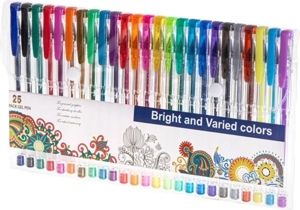 Ta vsestranski set gelnih pisal je idealen za otroke, študente in odrasle. Vsebuje 25 skrbno izbranih kosov: 12 bleščečih za efektno okraševanje, 7 kovinskih za stilske poudarke, 3 fluorescentna za izrazito poudarjanje ter 3 klasične barve (črna, modra, rdeča) za vsakodnevno pisanje. Prosojno ohišje omogoča nadzor nad nivojem črnila, nežen vrh pa zagotavlja natančne linije.