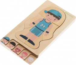 Komplet vsebuje leseno osnovo in 28 posameznih delov, ki segajo od okostja do oblačilne figure. Zaradi preprostega dizajna in naravnih materialov sestavljanka podpira načela metodike Montessori, ki se osredotoča na celovit razvoj otroka.