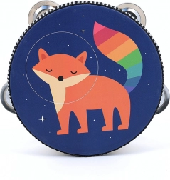 Tamburin krasi prikupna ilustracija lisice z mavričnim repom na modrem ozadju, kar otrokom ponuja vesel način ustvarjanja glasbe.