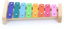 Ksilofon z mavričnimi kovinskimi tipkami na lesenem podstavku. Vsaka tipka je označena z noto, kar olajša učenje glasbe.