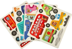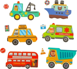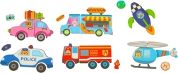 Avtobus, reševalno vozilo, taksi, policijski avto, tovornjak, ladja in raketa. Dodatni elementi, kot so stožci in prometni znaki, oživijo vsako sceno.