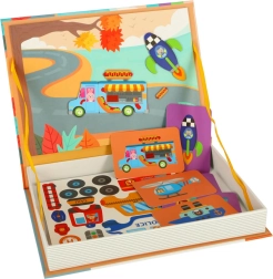 Ta magnetna sestavljanka spremeni vsako odprtje »knjige« v igrivo potovanje po svetu prometa. Dovolj je odpreti pokrov z magnetno tablico, izbrati karto z vzorcem ali vključiti domišljijo in iz barvitih magnetov sestavljati lastna vozila in scene. Otroci bodo uživali pri ustvarjanju gasilskega vozila, reševalnega vozila, avtobusa, taksija, policijskega avta, tovornjaka, ladje in rakete – ter številnih drugih kombinacij.