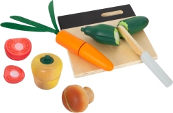 Ta leseni set rezalne zelenjave je idealen za igre trgovinice, kuhanja in male kuharske izzive. Paprika, šampinjon, paradižnik, kumara in korenje so razdeljeni na dele in povezani s sprijemalnim trakom, zato jih lahko otroci znova in znova “režejo” z varnim lesenim nožem. Priložena je tudi deska z ušescem za obešanje in tabo za pisanje s kredo – odlična za nakupovalne sezname ali recepte.