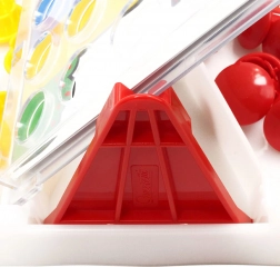 Plošča tvori pokrov kovčka, zato vsi deli ostanejo pospravljeni, igrača pa se zlahka prenaša kamor koli.