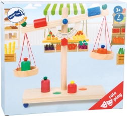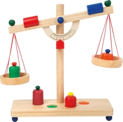 Ta vzvodna tehtnica, izdelana iz kakovostnega masivnega lesa, je opremljena s štirimi klasičnimi in dvema premičnima utežema. Otroci jo lahko enostavno uporabijo za tehtanje različnih predmetov, kot so sadje ali zelenjava. Zaradi barvnih komponent je ta izdelek zelo zabaven in hkrati poučen.