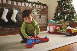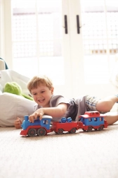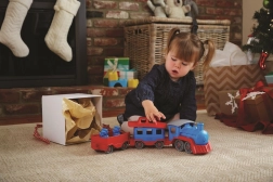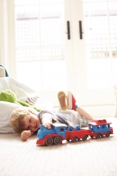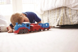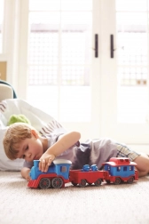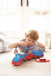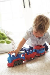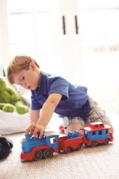 Vsi na vlak! Ta robusten vlak znamke Green Toys z lokomotivo in dvema vagonoma prinaša ustvarjalno igro doma in na prostem. Izdelan je iz 100 % reciklirane plastike iz steklenic za mleko, ne vsebuje BPA, PVC in ftalatov ter nima kovinske osi ali zunanjega premaza. Priložena sta tudi dva medvedja sprevodnika, vsi deli pa se zlahka razstavijo in očistijo v pomivalnem stroju.