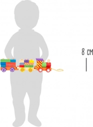 Zabaven vlečni vlakec za najmlajše razvija motoriko, koordinacijo in domišljijo. Zahvaljujoč barvnim lesenim blokom je mogoče zlahka spreminjati videz lokomotive in dveh vagončkov, ki ju je mogoče povezati in vleči z vrvico. Vesele barve in vzorci vabijo k igri in učenju.