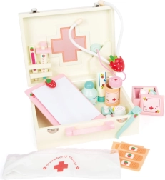 Z realističnimi dodatki, kot so stetoskop, termometer, injekcijska brizga, mazila in zdravila, otroci razvijajo socialne veščine, empatijo in komunikacijo. Trpežni materiali (les, tekstil in papir) zagotavljajo varno in dolgotrajno zabavo.